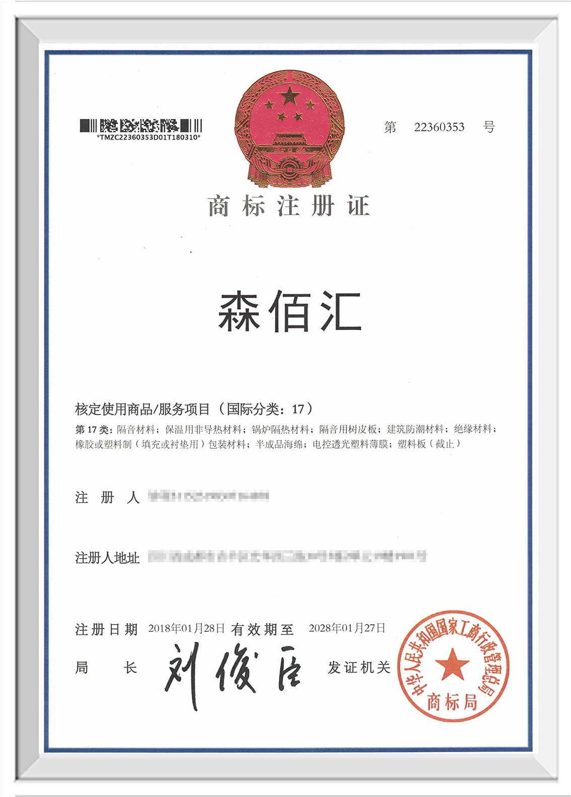 滨州“森佰汇”商标证书下发至企业